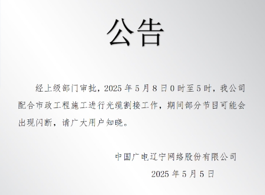 經(jīng)上級(jí)部門審批,2025年5月8日0時(shí)至5時(shí),我公司配合市政工程施工進(jìn)行光纜割接工作,期間部分節(jié)目可能會(huì)出現(xiàn)閃斷,請(qǐng)廣大用戶知曉。
