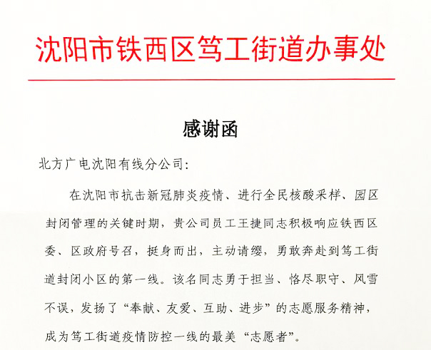 1月19日,北方廣電網(wǎng)絡公司沈陽分公司接到沈陽市鐵西區(qū)篤工街道發(fā)來的感謝函,對公司員工王捷同志在沈陽市抗擊新冠疫情期間做出的突出貢獻表示由衷的感謝。
