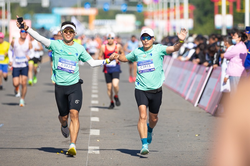 “悅跑”馬拉松隊(duì)長王剛與隊(duì)員談心攜手沖過終點(diǎn)線