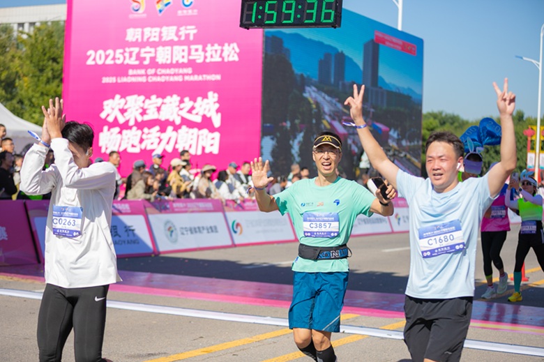 沖過終點(diǎn)線的“悅跑”馬拉松隊(duì)員陳光
