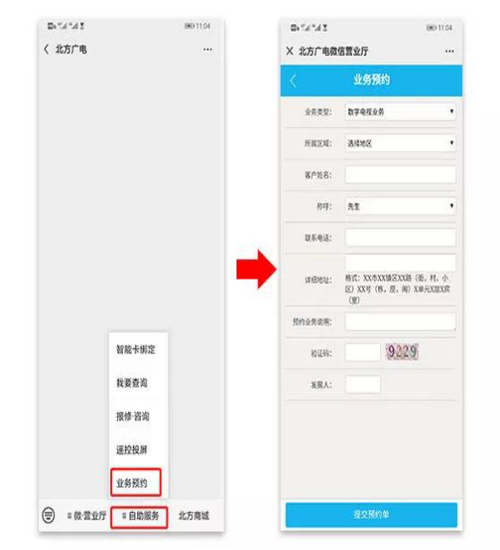 關(guān)注北方廣電微信服務(wù)號(hào),選擇菜單下方“自助服務(wù)—業(yè)務(wù)預(yù)約”,即可預(yù)約您想辦理的業(yè)務(wù)。