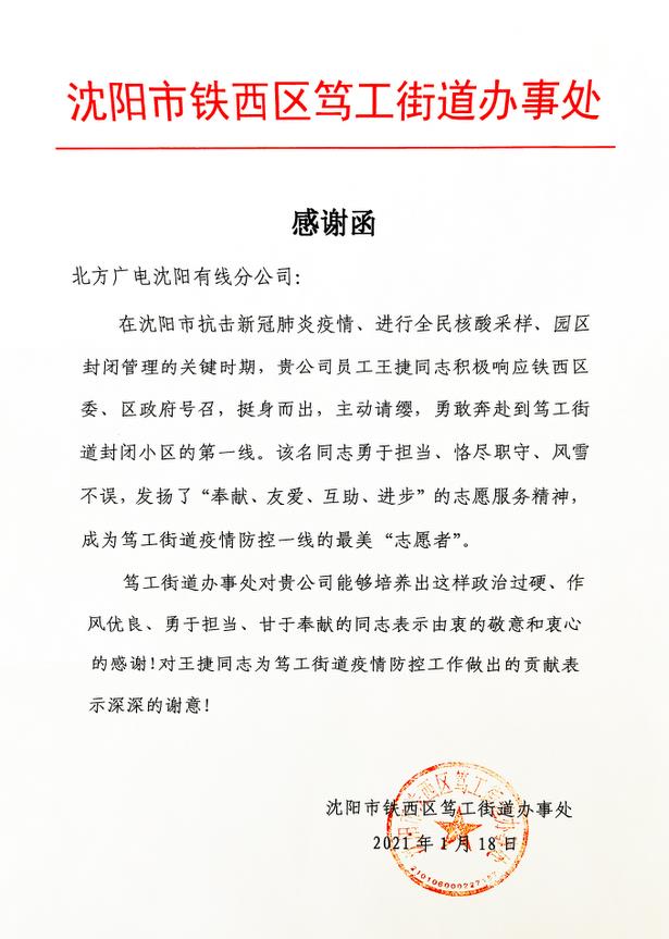 1月19日,北方廣電網(wǎng)絡(luò)公司沈陽分公司接到沈陽市鐵西區(qū)篤工街道發(fā)來的感謝函,對公司員工王捷同志在沈陽市抗擊新冠疫情期間做出的突出貢獻(xiàn)表示由衷的感謝。