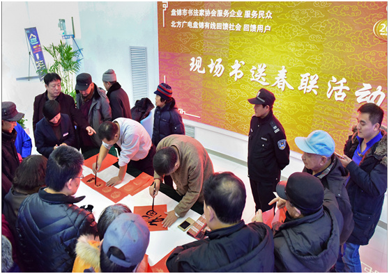 “猴去靈動(dòng)在,雞來福氣生”,為貼近客戶,節(jié)前造勢,營造歡樂祥和的新年、春節(jié)假日期間營銷宣傳氛圍,2016年12月29日,北方廣電網(wǎng)絡(luò)公司盤錦分公司、盤錦市書法家協(xié)會(huì)聯(lián)合舉辦“書法名家現(xiàn)場送春聯(lián)”活動(dòng)。十八位書法家同時(shí)揮毫潑墨為用戶和市民送上丁酉年的第一份新春祝福。