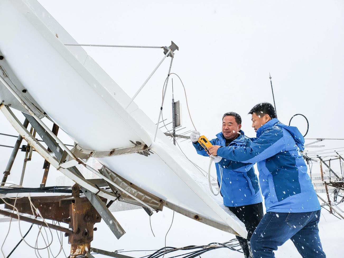 當(dāng)時,由于積雪層層堆積,衛(wèi)星天線平均積雪厚度超過了50cm,天線饋口已經(jīng)開始結(jié)冰,為避免“雪衰”威脅信號傳輸安全,天線除雪迫在眉睫。可由于雪化成冰,天線上既有雪還有冰碴子,清除冰雪難度可想而知。運維部經(jīng)理朱廣宇和副經(jīng)理付顏軍二話不說便帶頭沖出了門外,與相關(guān)技術(shù)人員一起攀爬被冰雪掩埋的外掛樓梯,在阜新市分公司辦公樓頂上和滿天飛雪中徒手作業(yè),歷時約兩個多小時,才將6個近3米高的衛(wèi)星天線上的冰雪清除干凈。