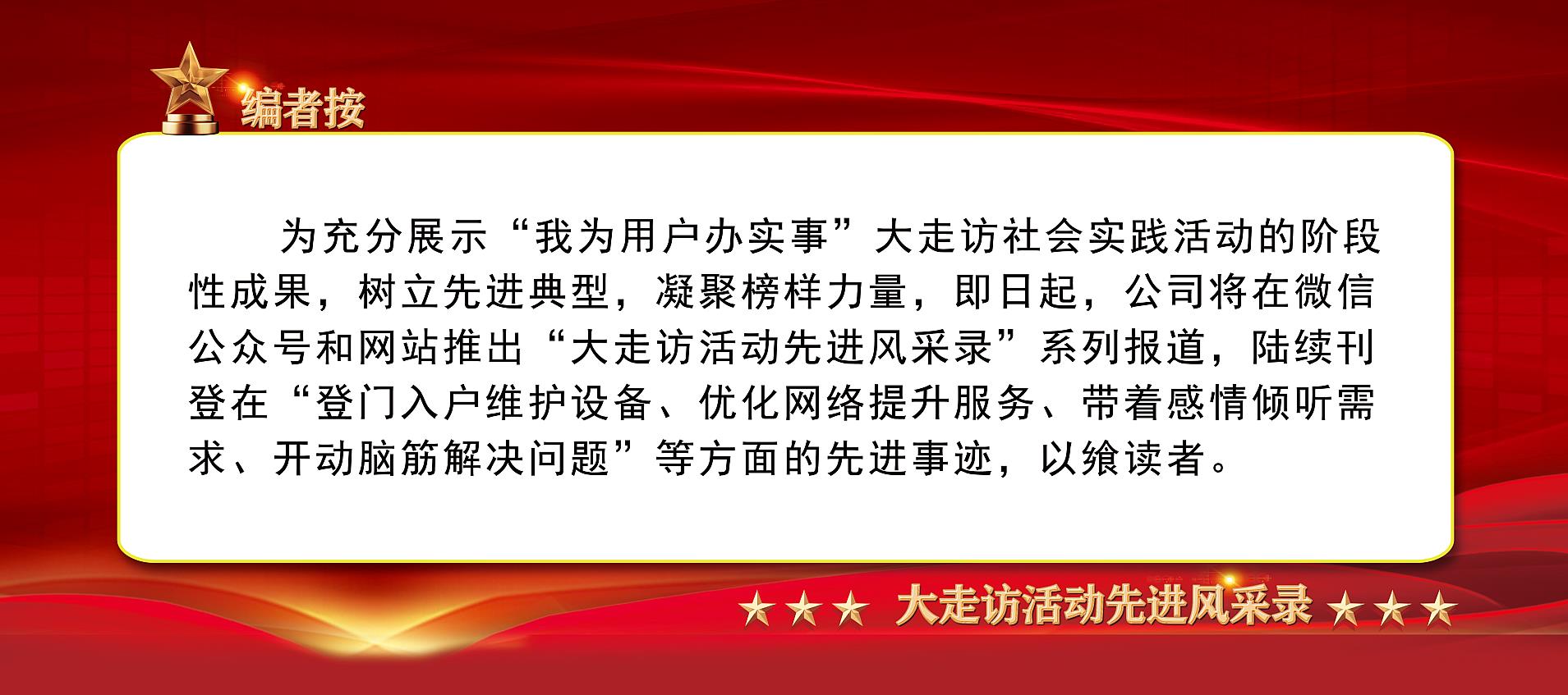 中國(guó)廣電遼寧網(wǎng)絡(luò)股份有限公司(簡(jiǎn)稱(chēng)中國(guó)廣電遼寧公司)鞍山市分公司湖南區(qū)域公司黨支部,在“我為用戶(hù)辦實(shí)事”大走訪(fǎng)社會(huì)實(shí)踐(簡(jiǎn)稱(chēng)大走訪(fǎng))活動(dòng)中,充分發(fā)揮戰(zhàn)斗堡壘作用,實(shí)施黨員與職工群眾“一對(duì)一”結(jié)對(duì)互助,把走訪(fǎng)成果作為黨員“黨性”純不純的試金石。全體黨員開(kāi)動(dòng)腦筋,用心用力用情解決群眾“急難愁盼”問(wèn)題,深受廣大用戶(hù)好評(píng)。