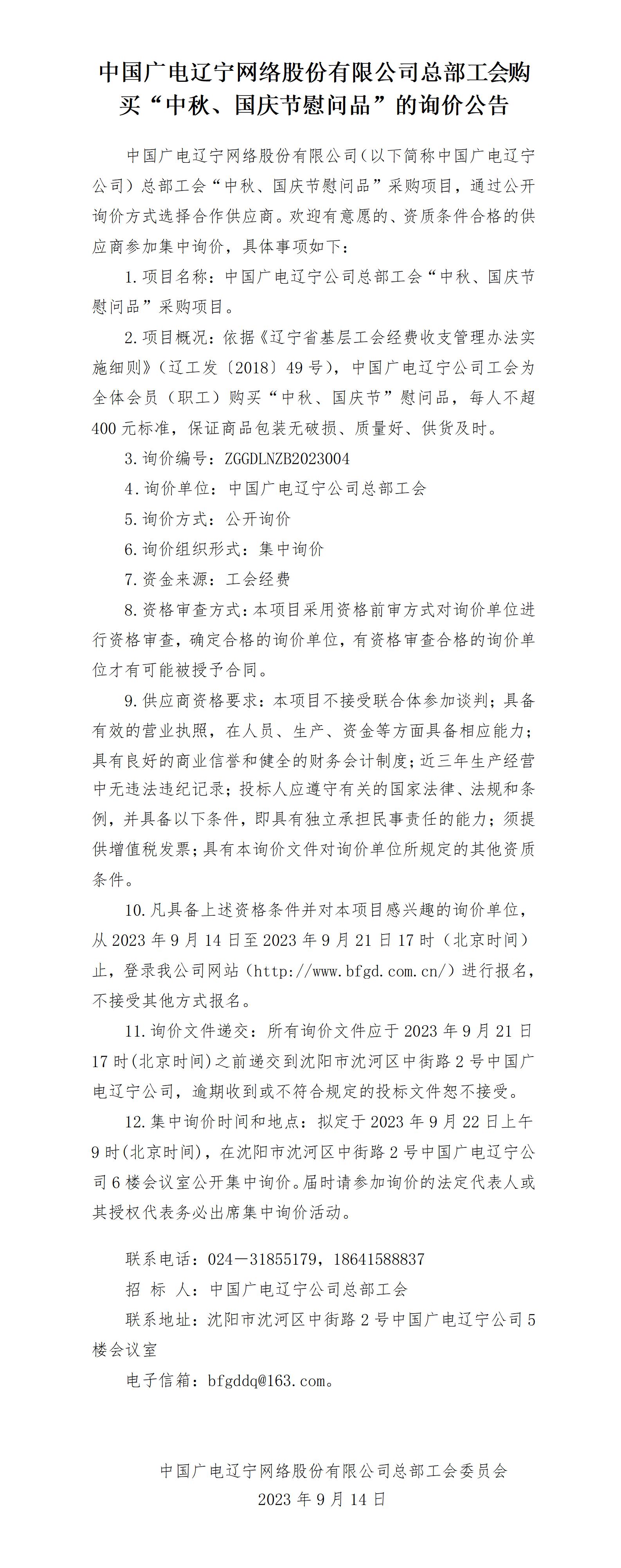 中國廣電遼寧網(wǎng)絡(luò)股份有限公司總部工會購買“中秋、國慶節(jié)慰問品”的詢價公告
