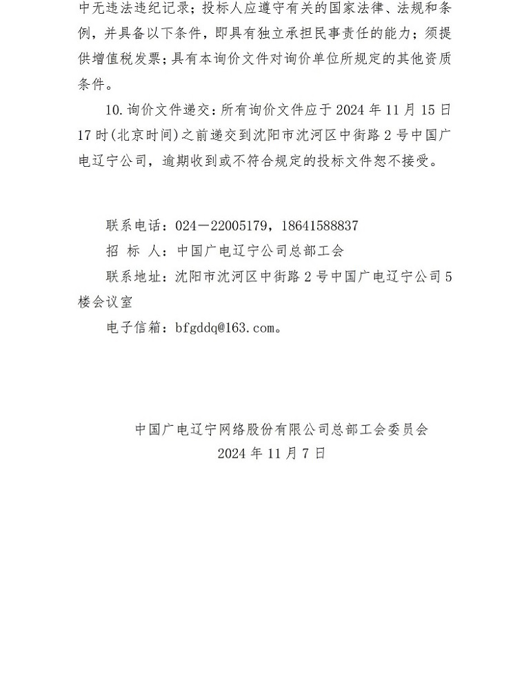 中國(guó)廣電遼寧網(wǎng)絡(luò)股份有限公司總部工會(huì)購(gòu)買“中秋、國(guó)慶節(jié)慰問(wèn)品”的詢價(jià)公告