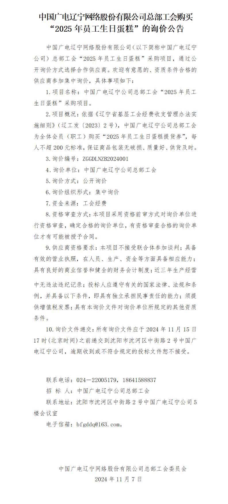 中國(guó)廣電遼寧網(wǎng)絡(luò)股份有限公司總部工會(huì)購(gòu)買“2025年員工生日蛋糕”的詢價(jià)公告