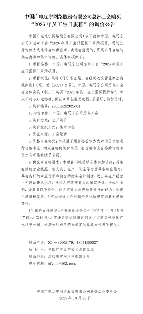 中國(guó)廣電遼寧網(wǎng)絡(luò)股份有限公司總部工會(huì)購(gòu)買“2026年員工生日蛋糕”的詢價(jià)公告