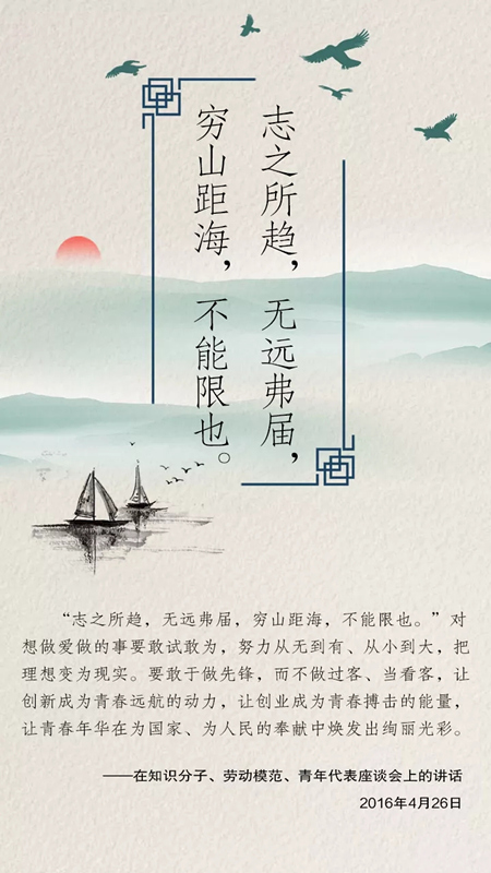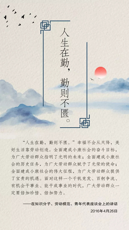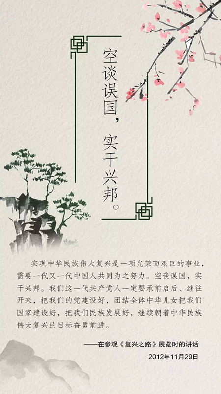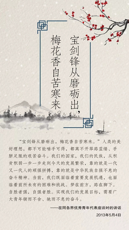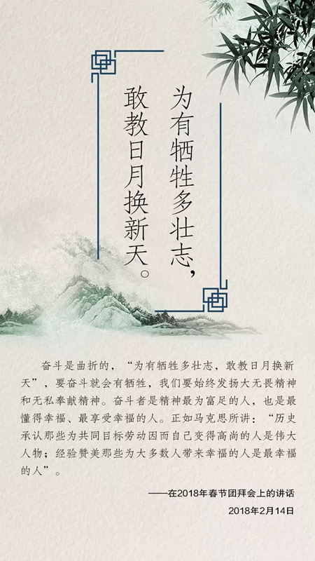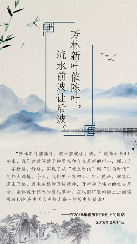 東風(fēng)隨春歸,發(fā)我枝上花。春天是起點(diǎn),是成長(zhǎng),是希望。踏著春天的腳步,新時(shí)代的我們?cè)僖淮纬霭l(fā)。今年是新中國(guó)成立70周年,是全面建成小康社會(huì)、實(shí)現(xiàn)第一個(gè)百年奮斗目標(biāo)的關(guān)鍵之年。習(xí)近平總書(shū)記引用的這八句古典名句,送給正在奮斗路上的你。