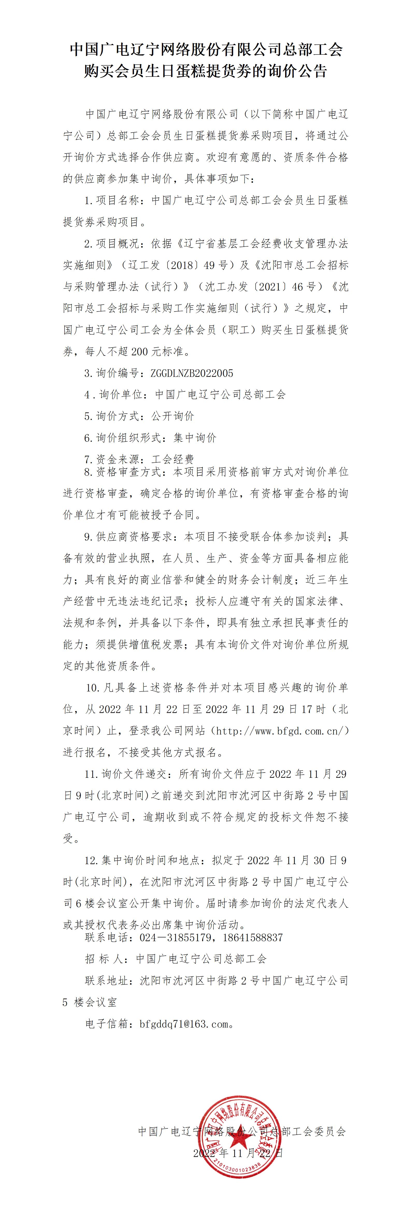 中國廣電遼寧網(wǎng)絡(luò)股份有限公司總部工會(huì)購買“2023年會(huì)員生日蛋糕提貨券”的詢價(jià)公告