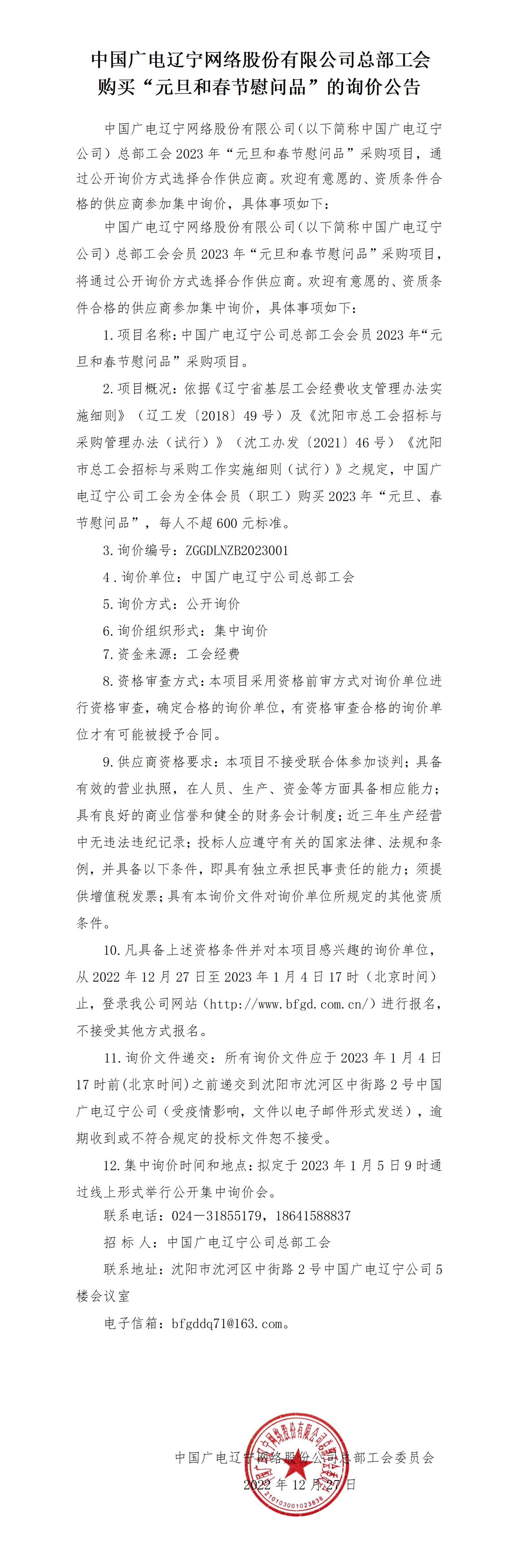中國廣電遼寧網(wǎng)絡(luò)股份有限公司總部工會購買“元旦和春節(jié)慰問品”的詢價公告