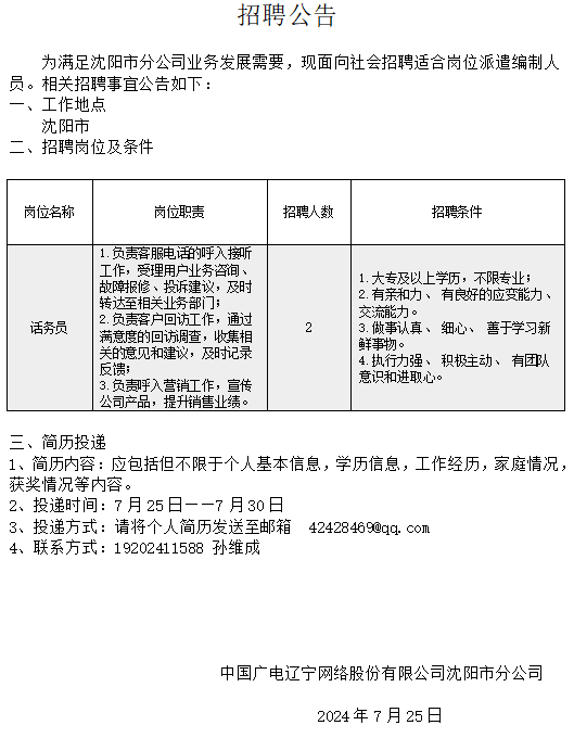 沈陽市分公司話務(wù)員招聘