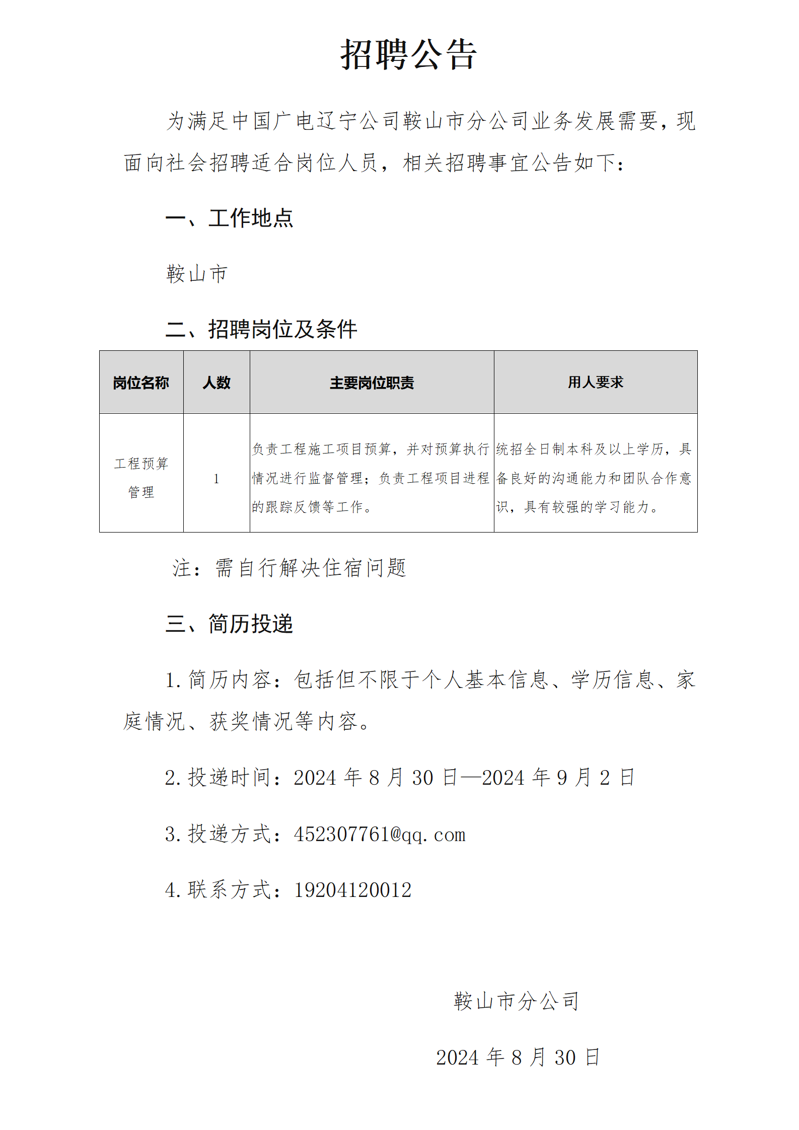 鞍山市分公司招聘