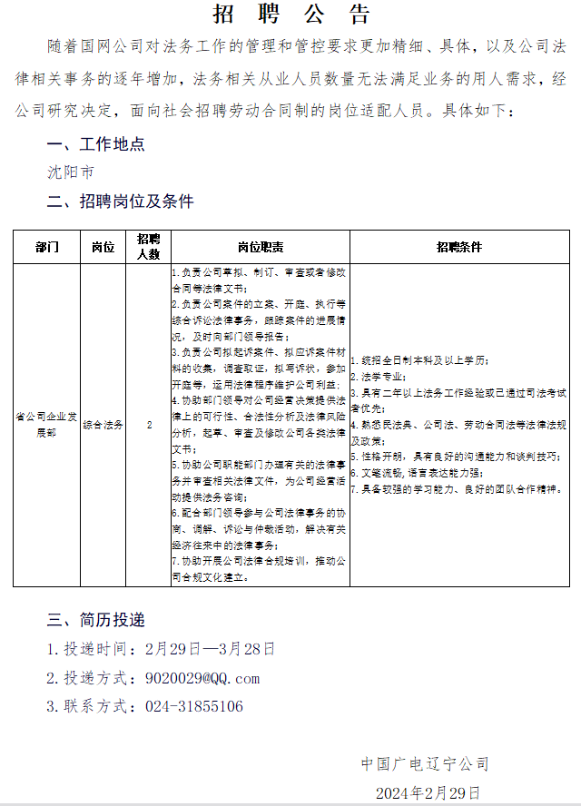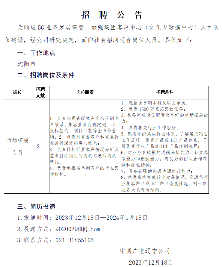 中國廣電遼寧公司遼陽市分公司對外招聘
