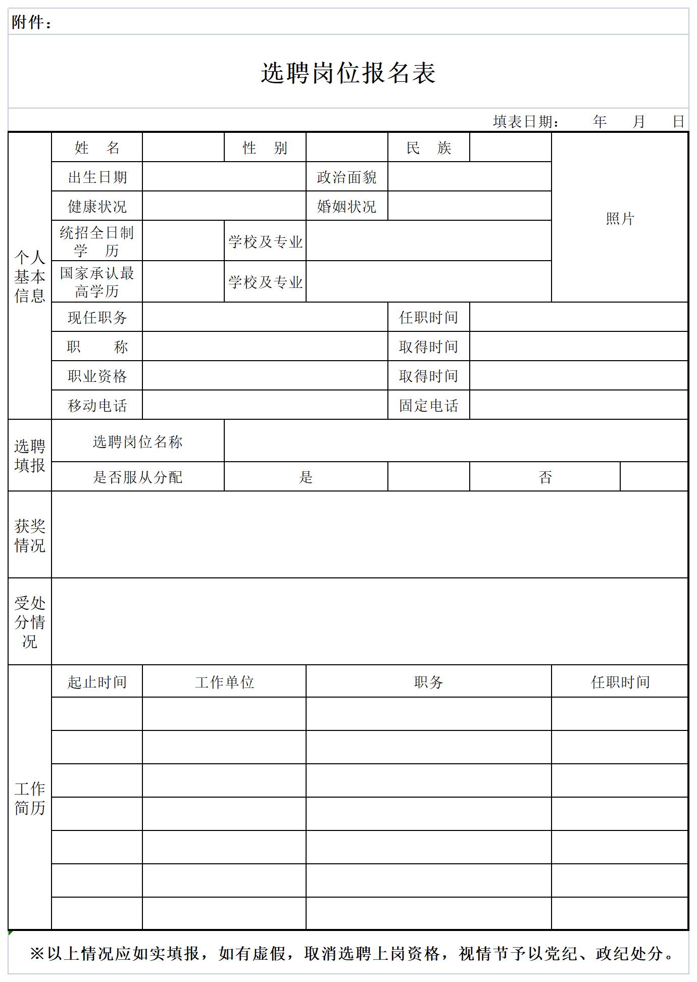 1.參與選聘人員需填寫《選聘崗位報名表》,于10月9日17:00前通過郵箱(9020029@QQ.com)提報選聘工作領(lǐng)導(dǎo)小組辦公室,并電話告知聯(lián)系人。電子版文件名的編寫為統(tǒng)一格式,具體為:現(xiàn)單位+現(xiàn)崗位/職務(wù)+姓名;